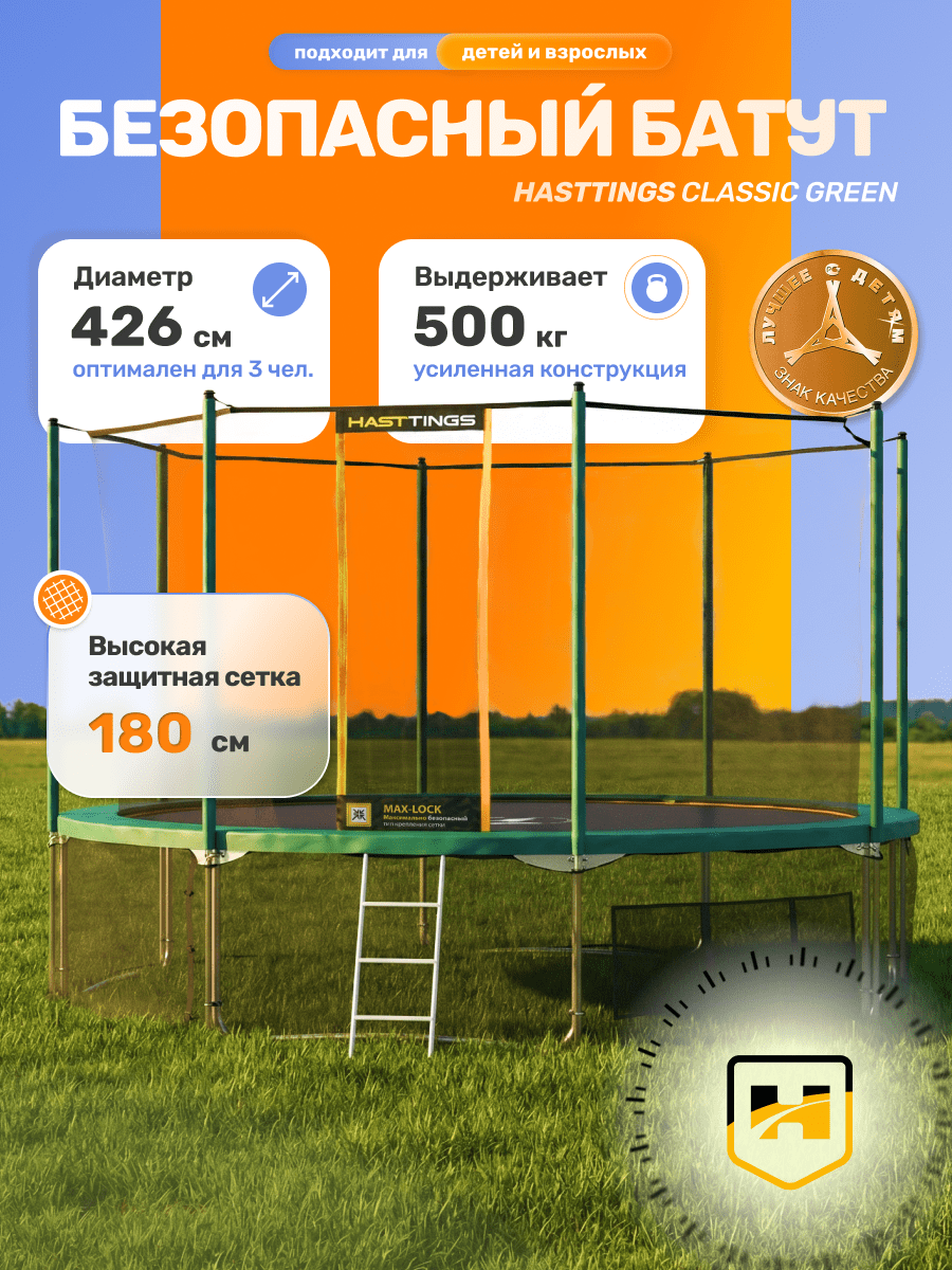 Батут Hasttings серии Classic признан товаром высокого качества и является двукратным обладателем премии "Лучшее детям". Регистрационный номер №11119L1312.