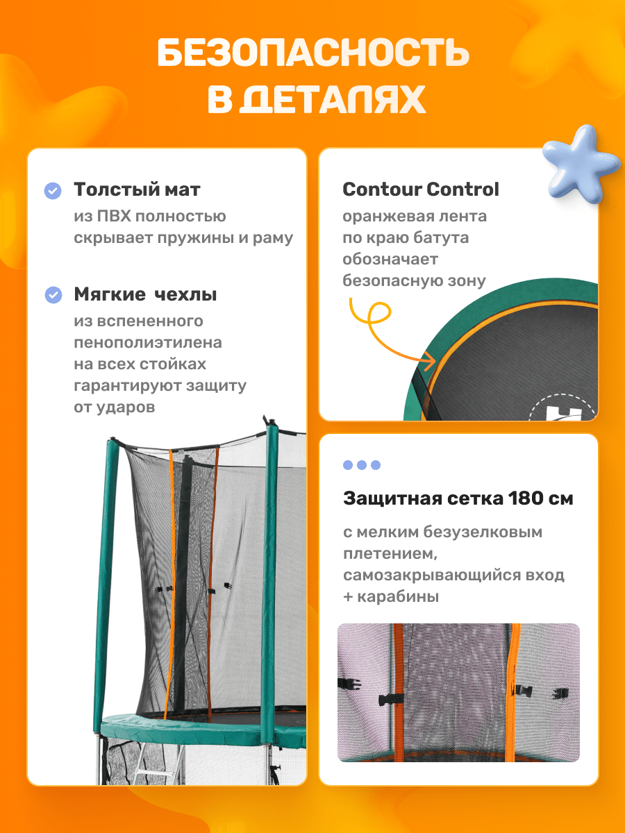 Безопасность. Теперь батуты поставляются с улучшенной верхней защитной сетью. В совокупности с новым плетением износоустойчивость сетки увеличивается, а безопасность детей сохраняется на высоком уровне.