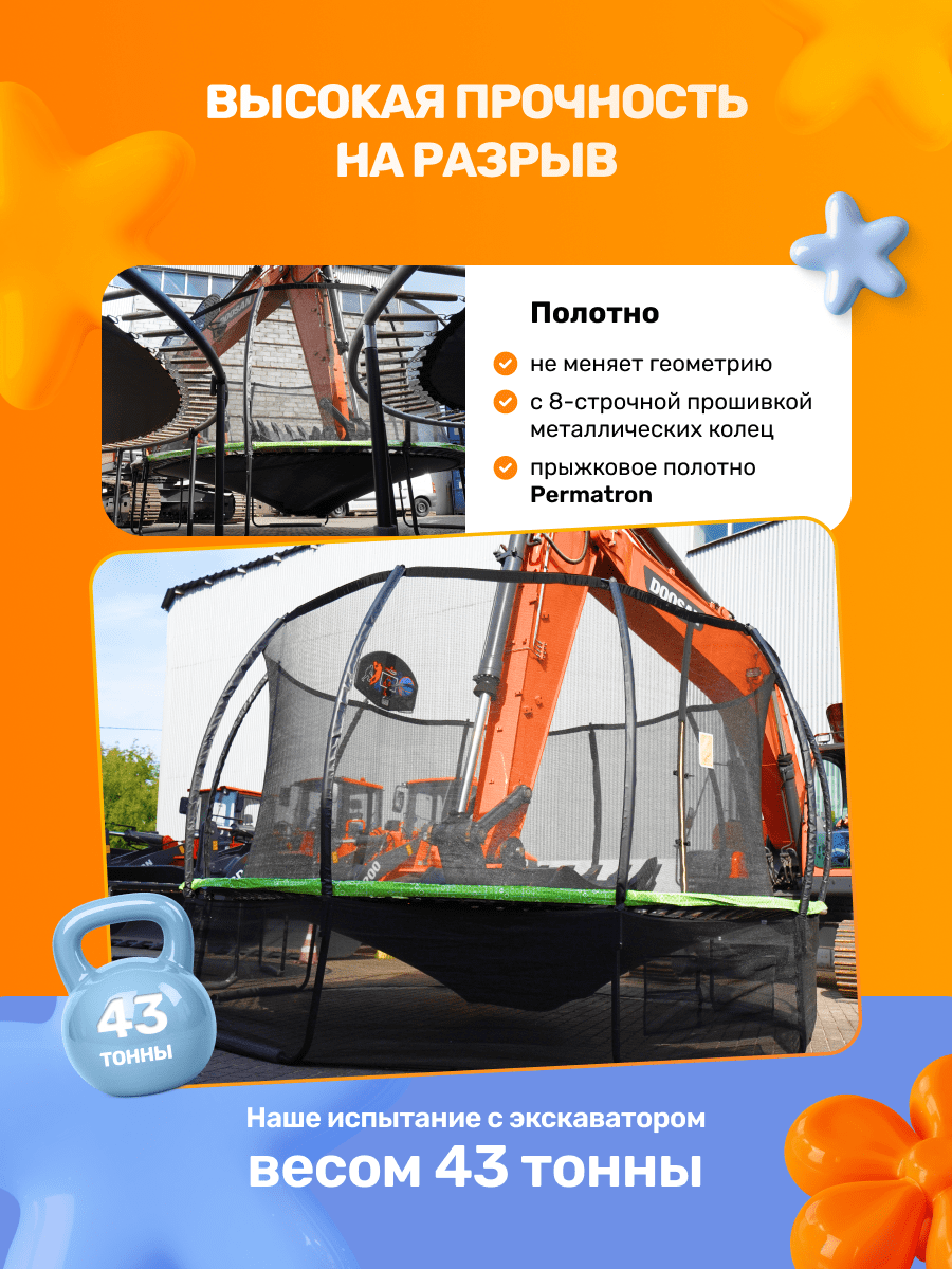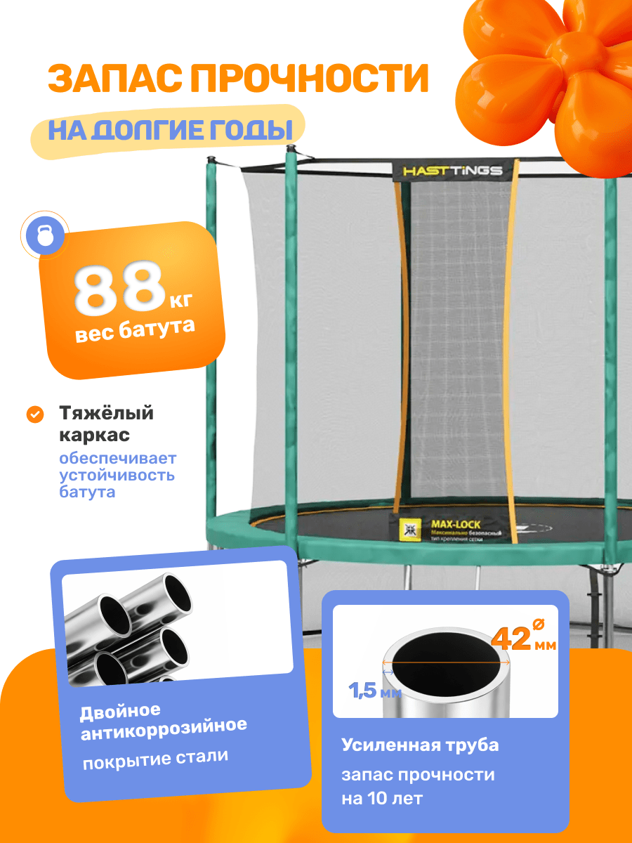 Надежность. Каркас батута в сборе может выдерживать статическую нагрузку до 500 кг. При соблюдении рекомендаций по сборке, хранению и эксплуатации, батут будет радовать Вас и Ваших близких не один сезон.