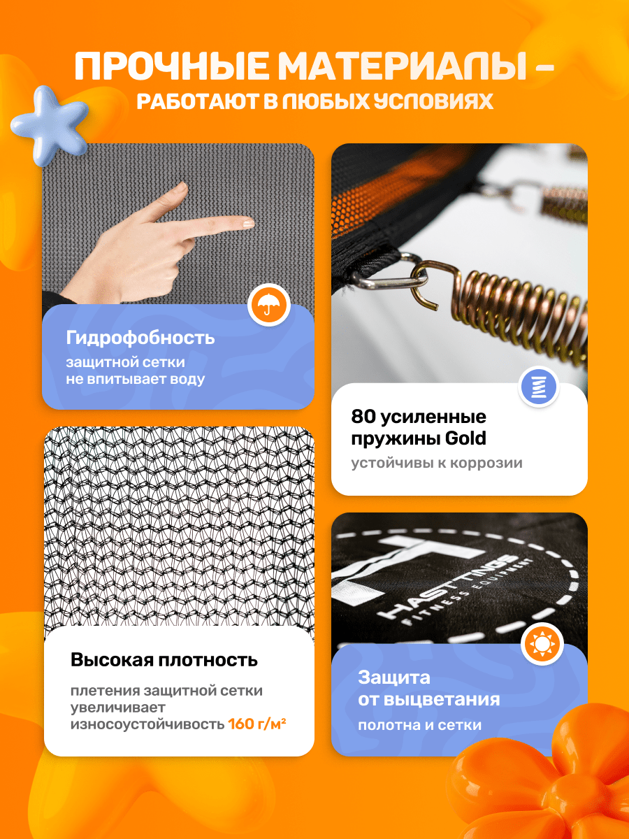 | Каркас батута | Гальванизированная сталь, ⌀38 х 1,4 мм / Гальванизированная сталь, ⌀42 х 1,5 мм | |