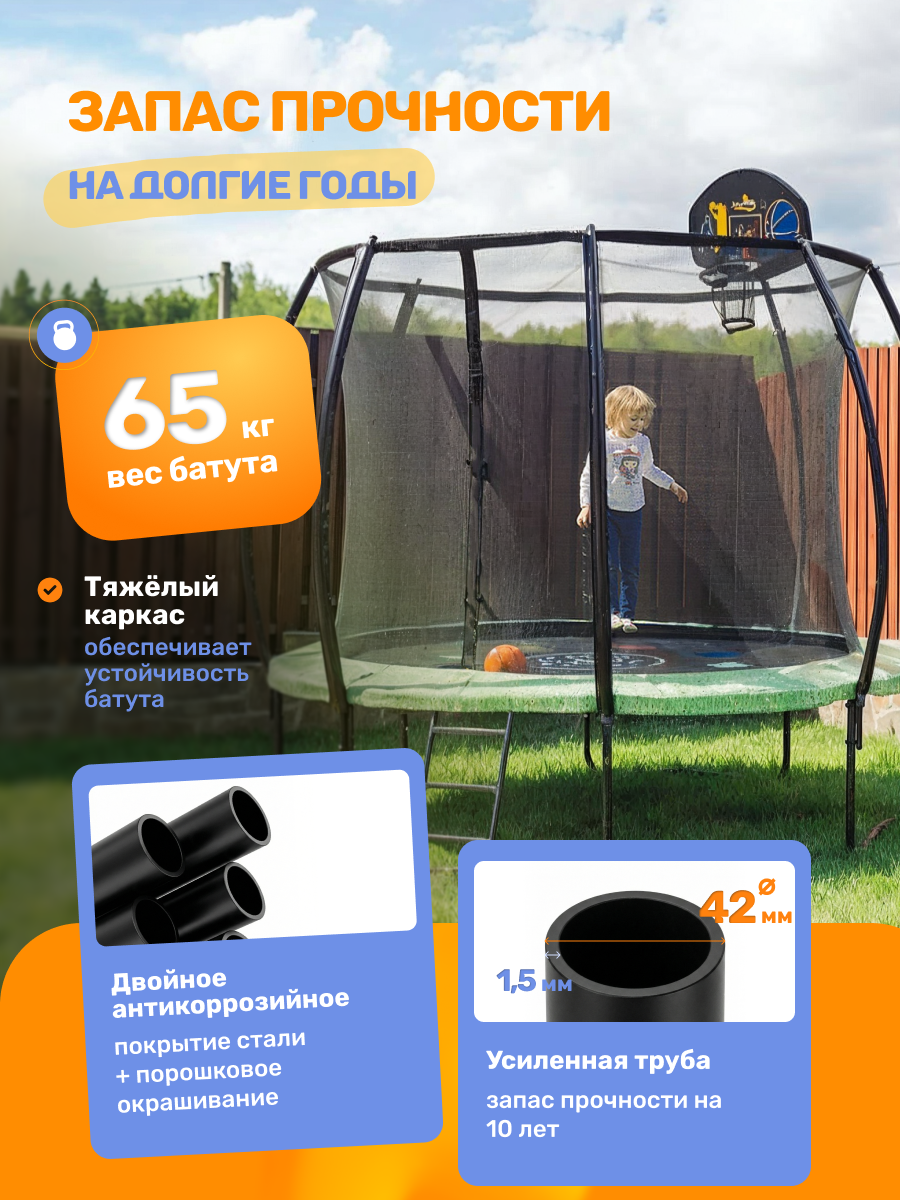 | Комплектация | Каркас батута, комплект пружин, защитный мат, верхняя защитная сетка, нижняя защитная сетка, лестница, теневой тент, баскетбольное кольцо, мяч, насос, ключ для установки пружин, набор инструментов и крепежей | |