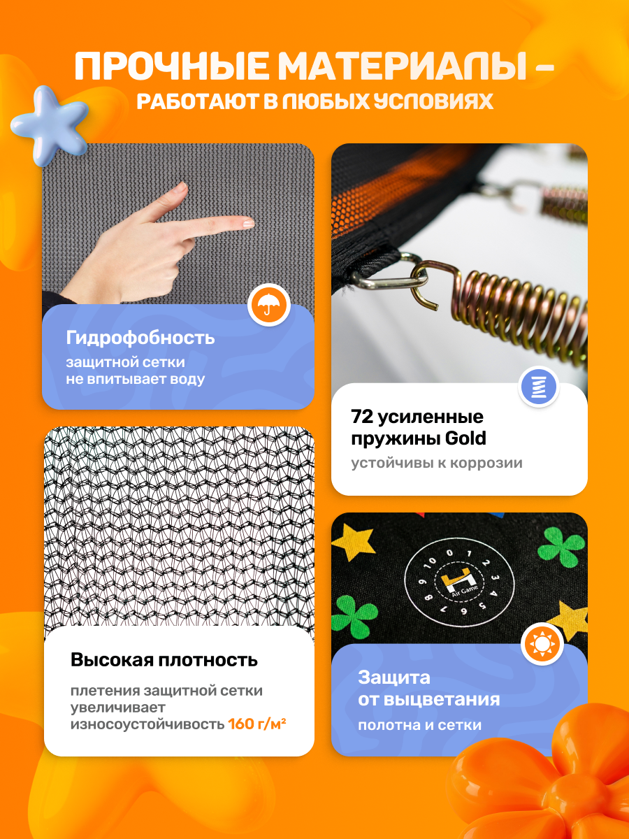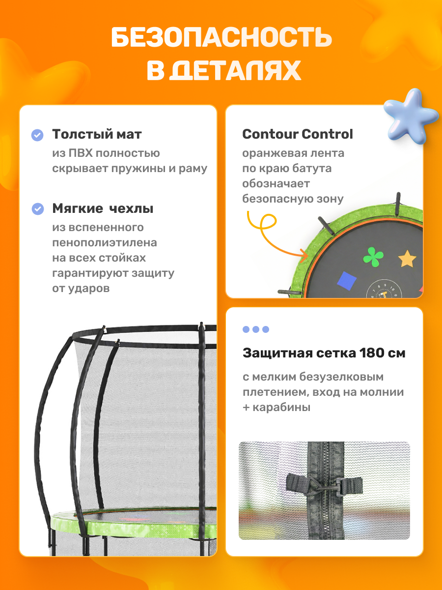 Безопасность. Благодаря инновационному, прямому, креплению защитной сети к прыжковому полотну, была достигнута максимальная защита от пружин при падении. Плетение настолько мало, что исключена любая возможность травмы, даже для самых маленьких пользователей.