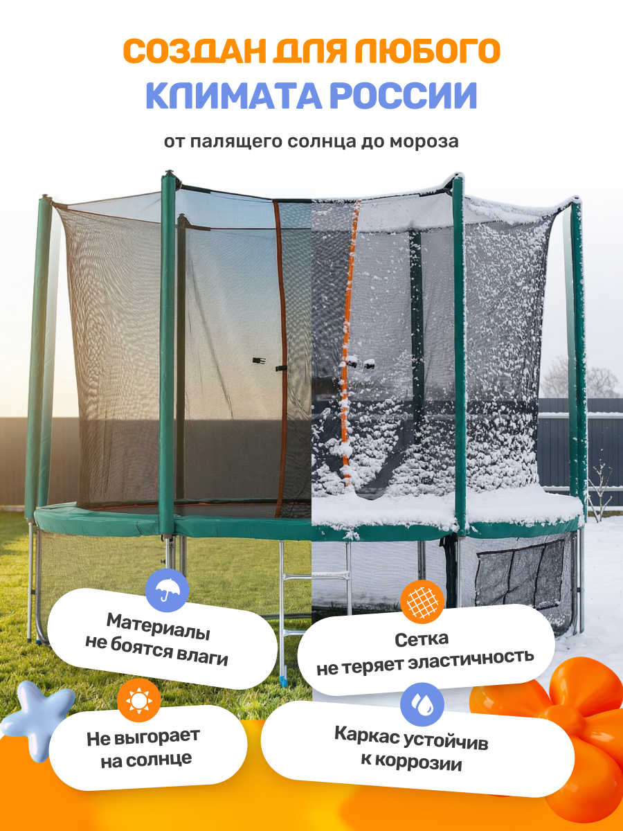 | Комплектация | Каркас батута, комплект пружин, защитный мат, верхняя защитная сетка, нижняя защитная сетка, лестница, ключ для установки пружин, набор инструментов и крепежей, тент-крыша | |