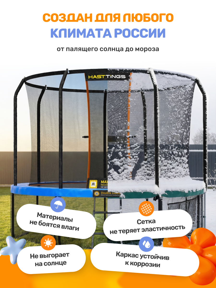 Батут можно легко усовершенствовать новыми аксессуарами, такими как сет для баскетбола, распылитель, тент и т.д. Эти дополнения сделают прыжки более увлекательными.