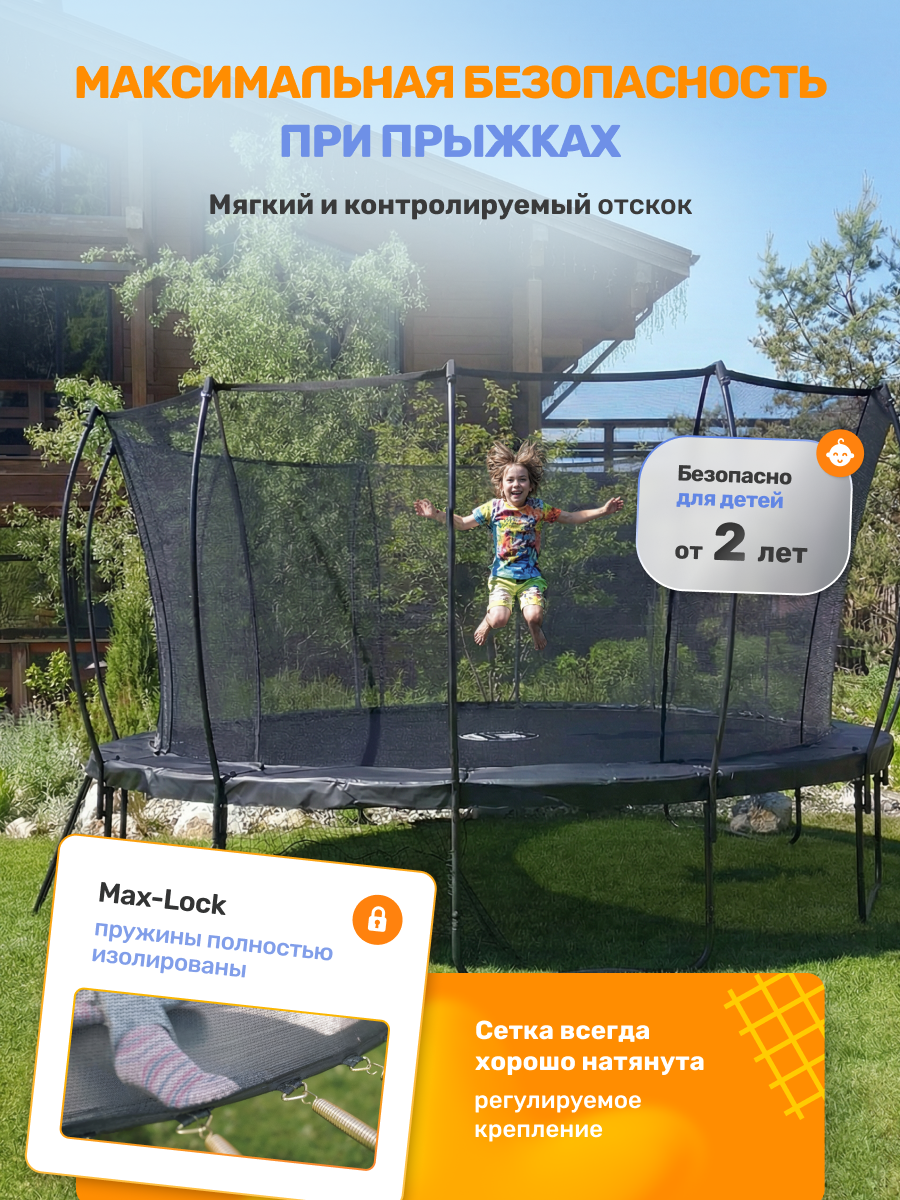 Безопасность с MaxLock. Благодаря инновационному креплению защитной сетки к прыжковому полотну, была достигнута максимальная защита от попадания в пружинный блок при падении.