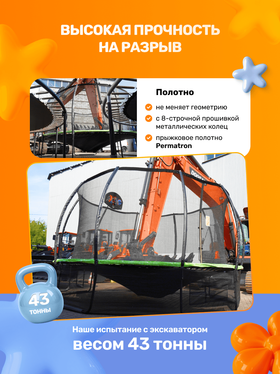 Надежность. Устойчивая рамная конструкция рассчитана на статическую нагрузку до 500 кг. На батуты серии Superfly мы даем 5 лет гарантии на раму. При соблюдении всех рекомендаций производителя, описанных в инструкции, батут прослужит Вам многие годы.