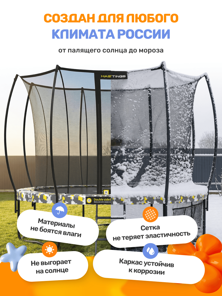 Благодаря двухстороннему защитному мату, вы можете в любой момент сменить стиль Вашего батута!