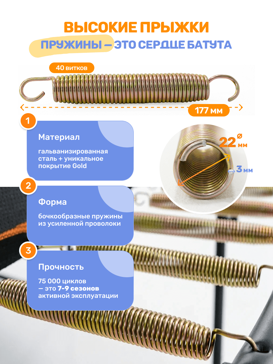 Чем сильнее пружина, тем выше отскок. Наши высокопрочные пружины создают стабильную базу для высоких прыжков. А конструкция раскрывающаяся к верху дает простор для трюков и движения