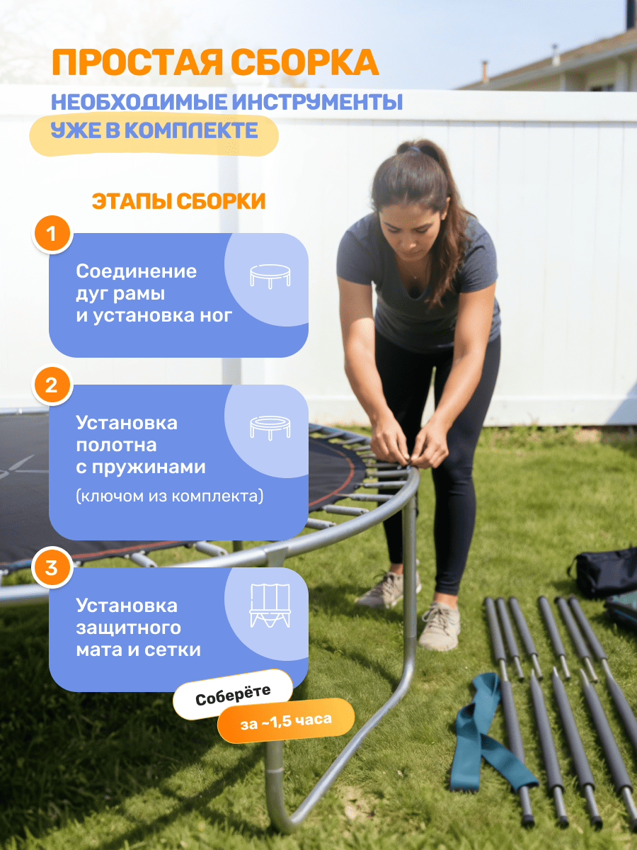 Сборку должны проводить только взрослые. Перед началом сборки тщательно изучите инструкцию. Используйте перчатки, чтобы защитить руки от защемления при сборке батута