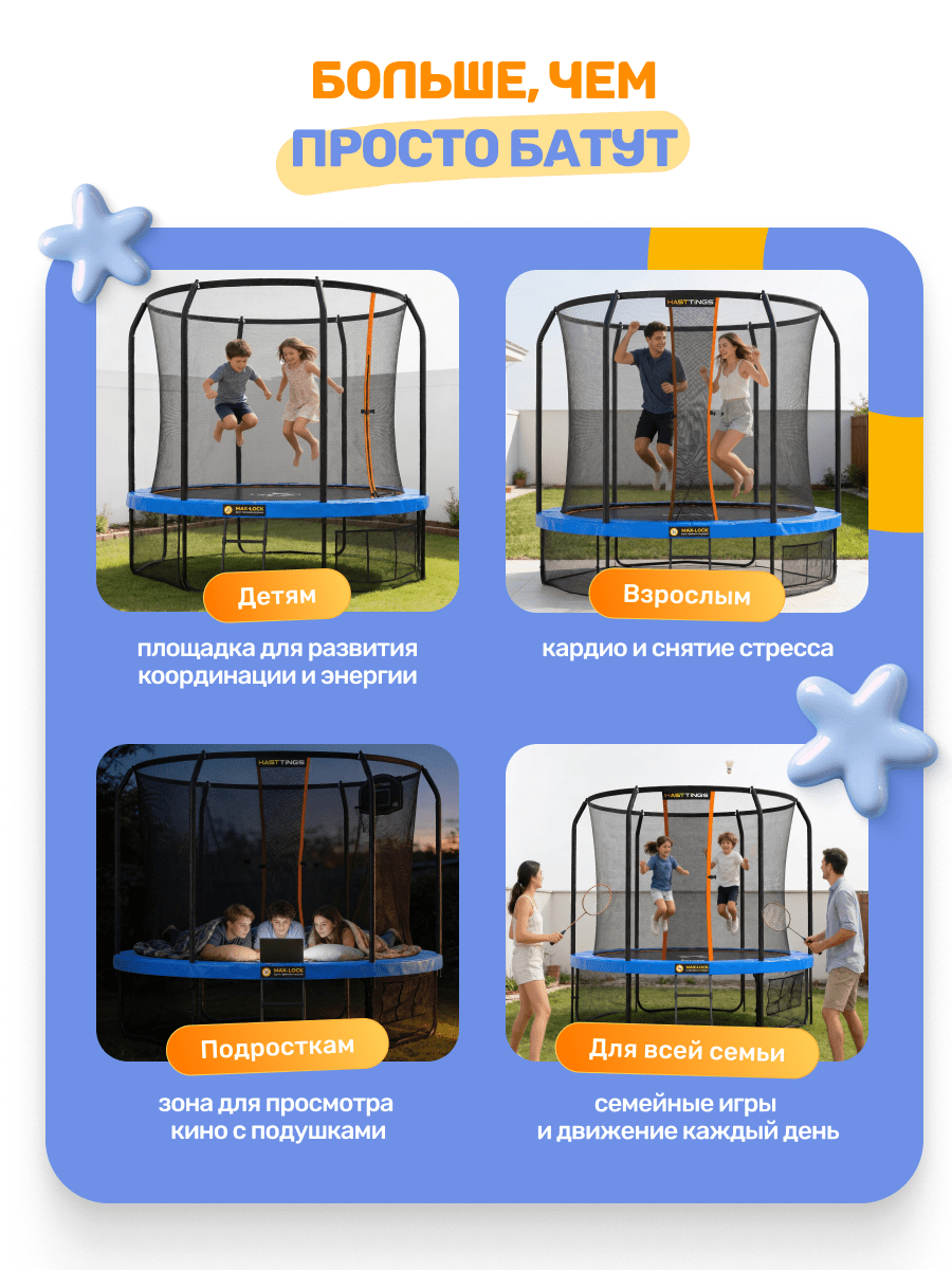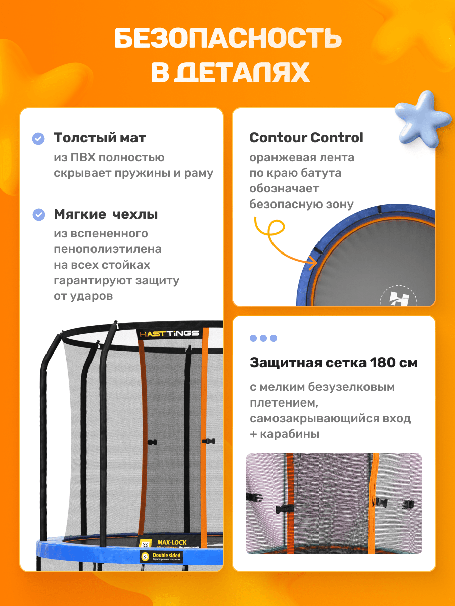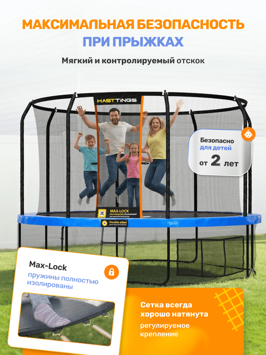 Сетка надёжно крепится к прыжковому мату по всему периметру батута. Уникальная система Max-Lock гарантирует, что дети не смогут провалиться в щели по краю прыжкового полотна.