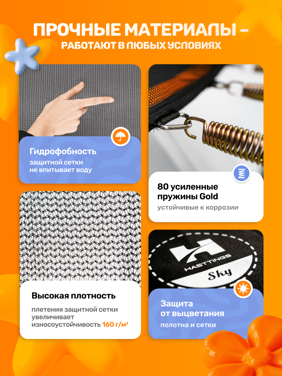 Батут можно легко усовершенствовать новыми аксессуарами, такими как сет для баскетбола, распылитель, тент и т.д. Эти дополнения сделают прыжки более увлекательными.