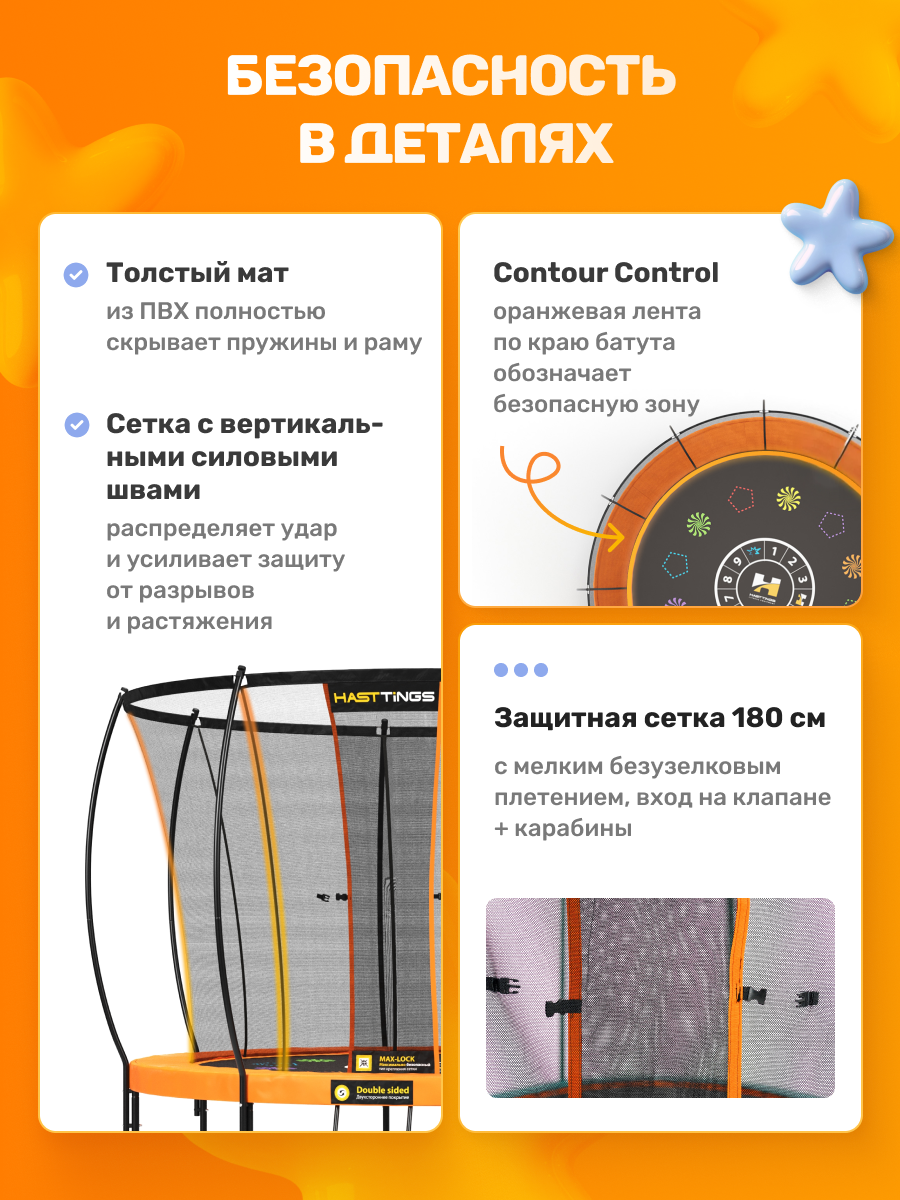 Обеспечивает безопасность и комфорт при прыжках, поддерживая форму сетки и предотвращая ее провисание. Он создает надежную структуру и добавляет эстетическую привлекательность, способствуя безопасному и приятному времяпрепровождению.