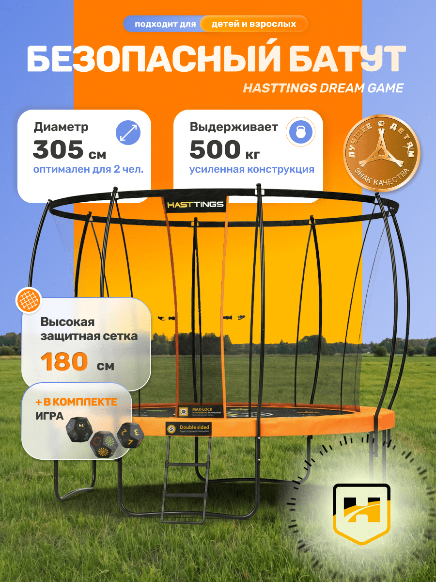 | Наименование | Батут Hasttings Dream Game 3,05 + Игровой набор Dream Game + Теневой тент + Футбольные ворота + Лестница-горка + Cет для баскетбола | |