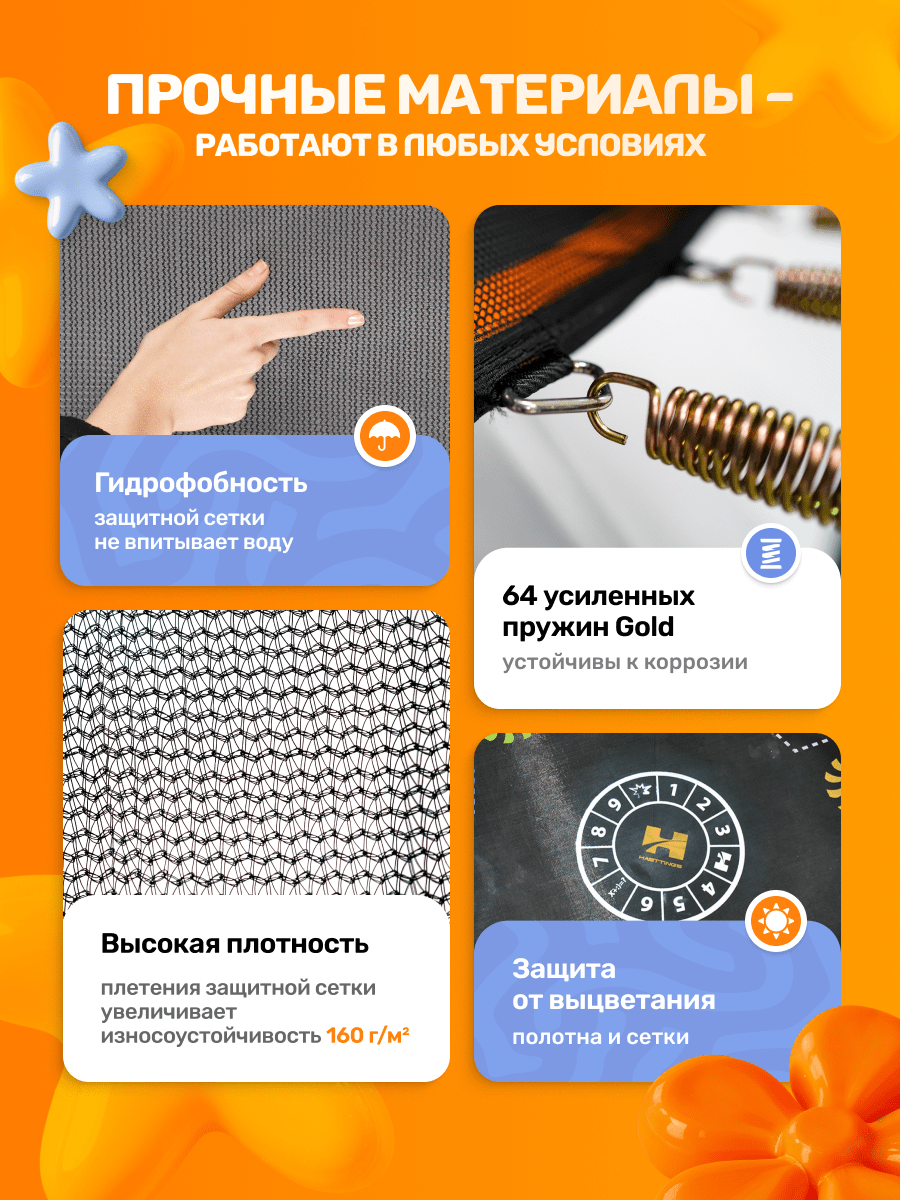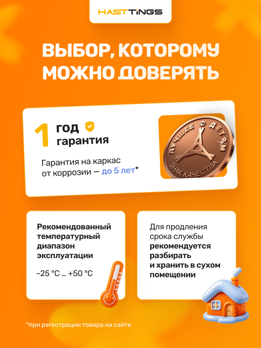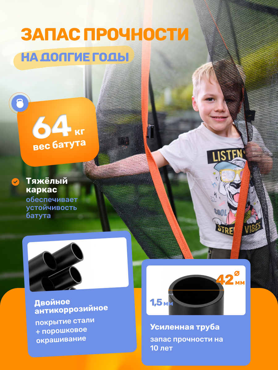 | Каркас батута | Гальванизированная сталь, ⌀38 х 1,4 мм / Гальванизированная сталь, ⌀42 х 1,5 мм | |