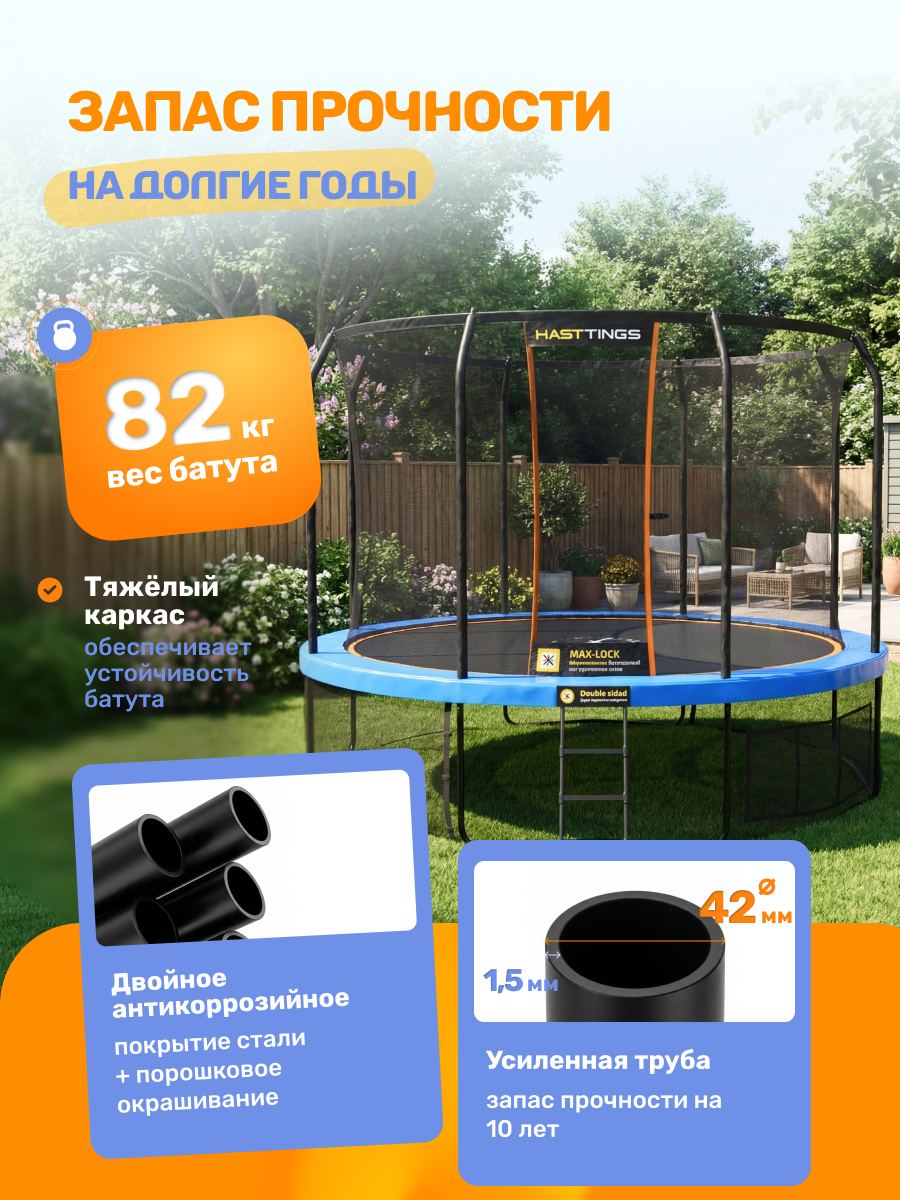 | Каркас батута | Гальванизированная сталь, ⌀38 х 1,4 мм / Гальванизированная сталь, ⌀42 х 1,5 мм | |