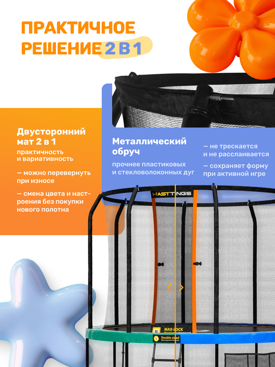 Благодаря двухстороннему защитному мату, вы можете в любой момент сменить стиль Вашего батута!