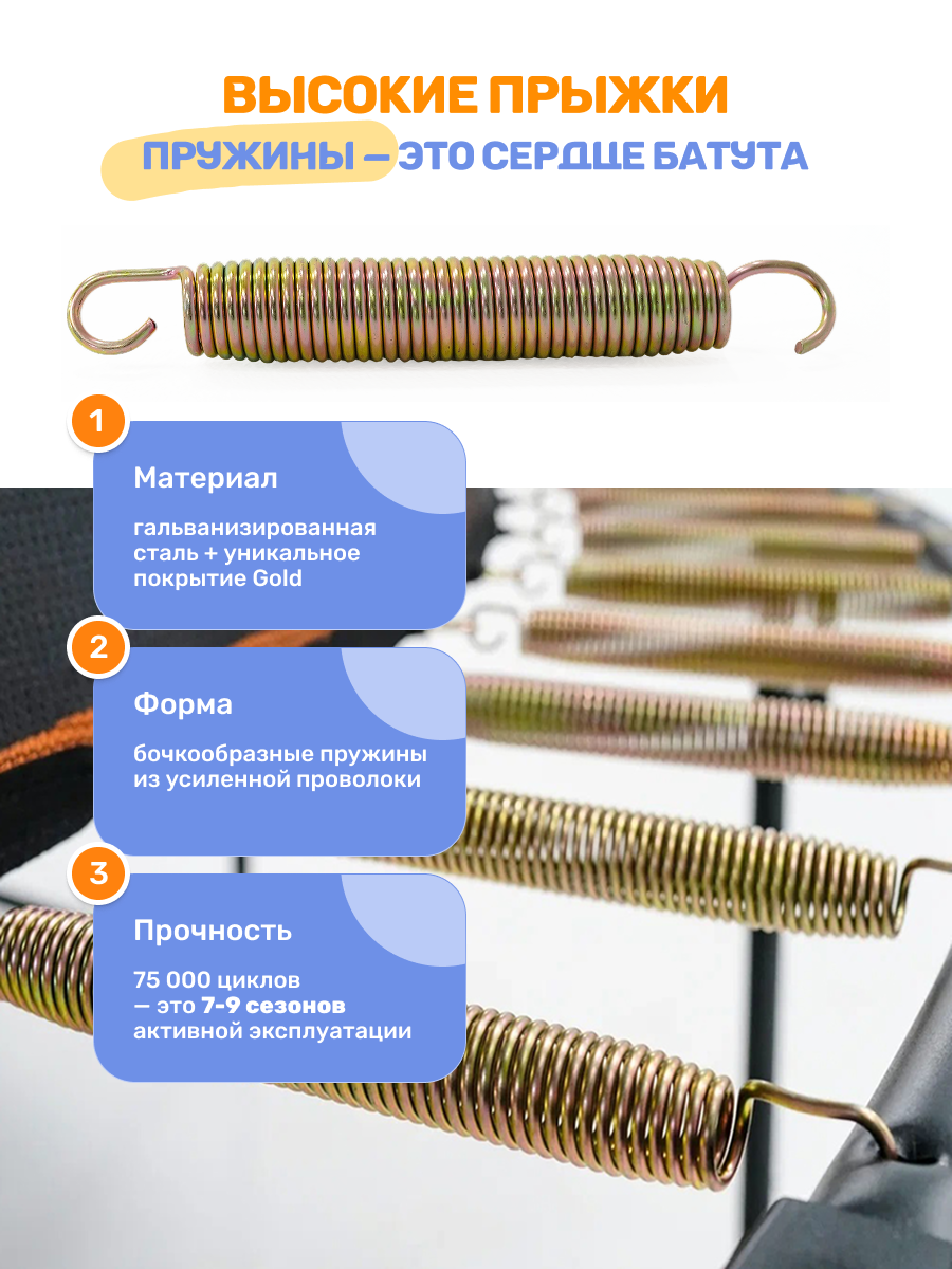 Внутренняя сетка располагается внутри границ батута, что предотвращает возможность падения пользователей за пределы прыжковой поверхности. Это особенно важно для детей, которые могут случайно выпрыгнуть за края на пружины.
