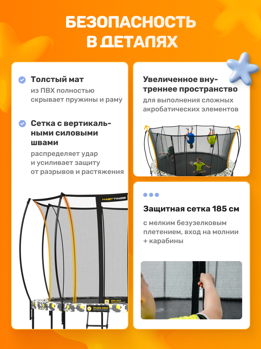 Сетка надёжно крепится к прыжковому мату по всему периметру батута. Уникальная система Max-Lock гарантирует, что дети не смогут провалиться в щели по краю прыжкового полотна