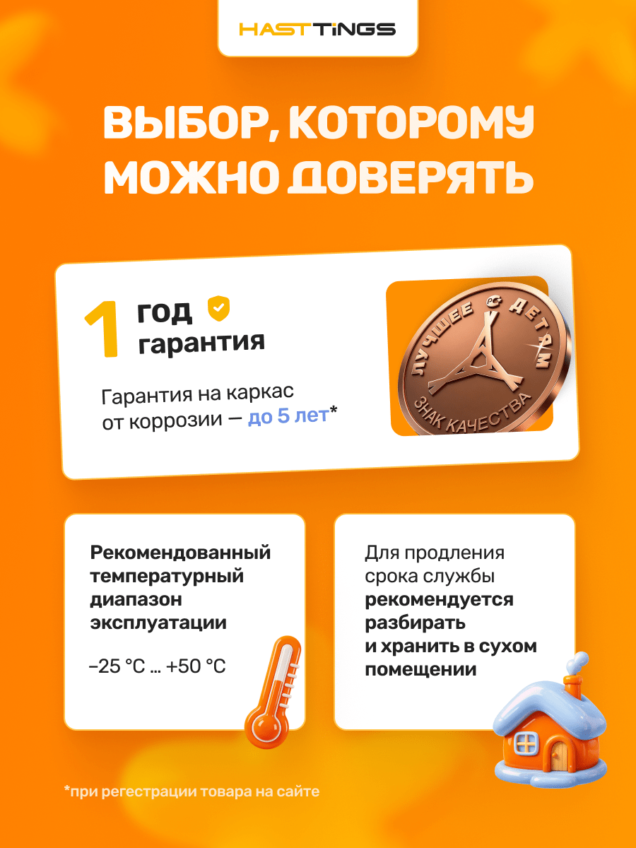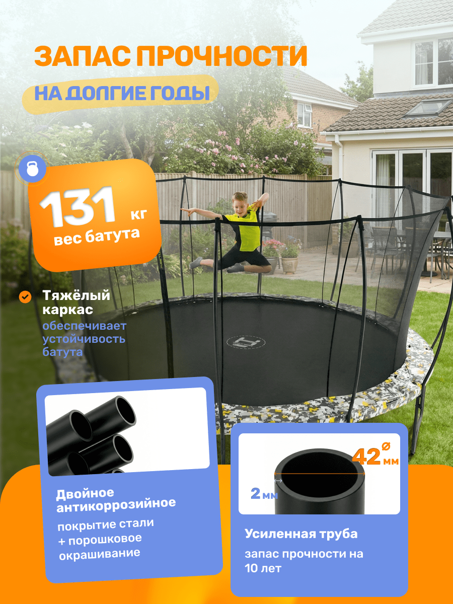 | Каркас батута | Гальванизированная сталь, ⌀38 х 1,5 мм / Гальванизированная сталь, ⌀42 х 2,0 мм | |
