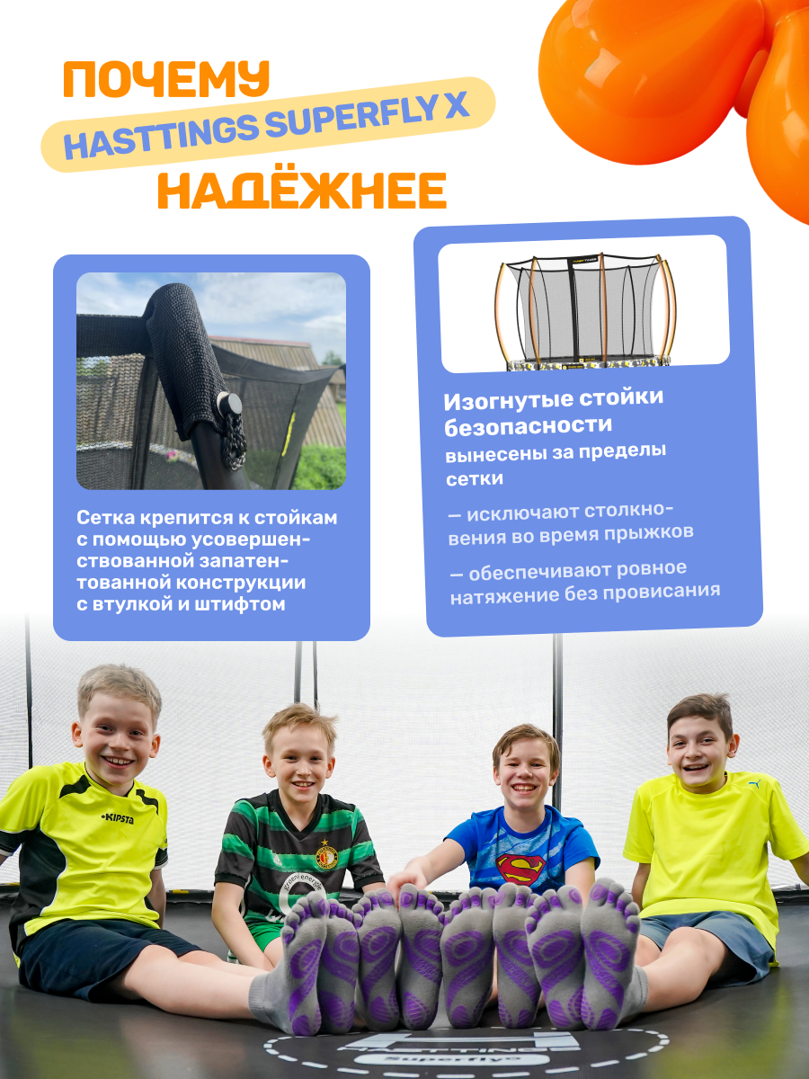 Преимущества. Батуты серии Superfly с увеличенным внутренним пространством. Благодаря расширенному верхнему радиусу защитной сетки батута, Вы получите намного больше внутреннего пространства для выполнения разных упражнений.