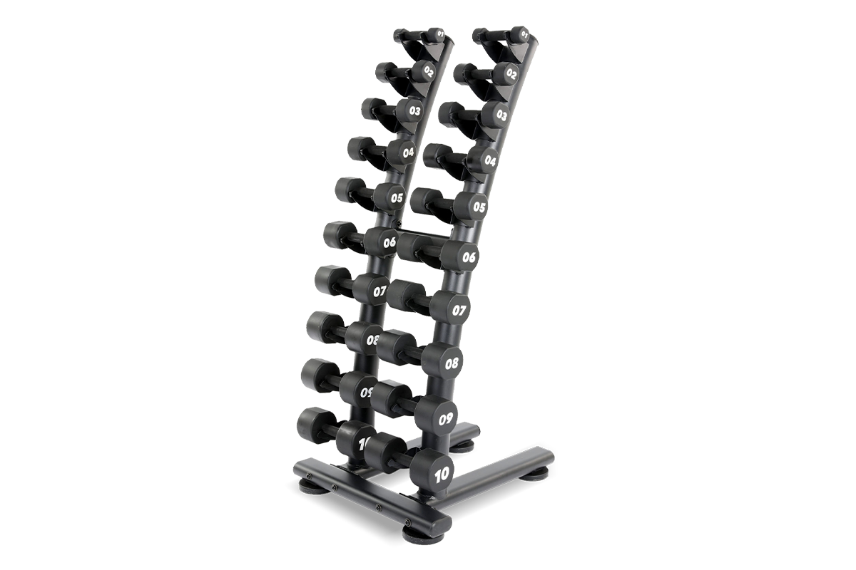 Простая и надежная конструкция фиксирует гантели на своем месте, двухслойное покрытие обеспечивает эстетичный вид и длительную эксплуатацию, дополнительные резиновые накладки на ножки гарантируют сохранность напольного покрытия.