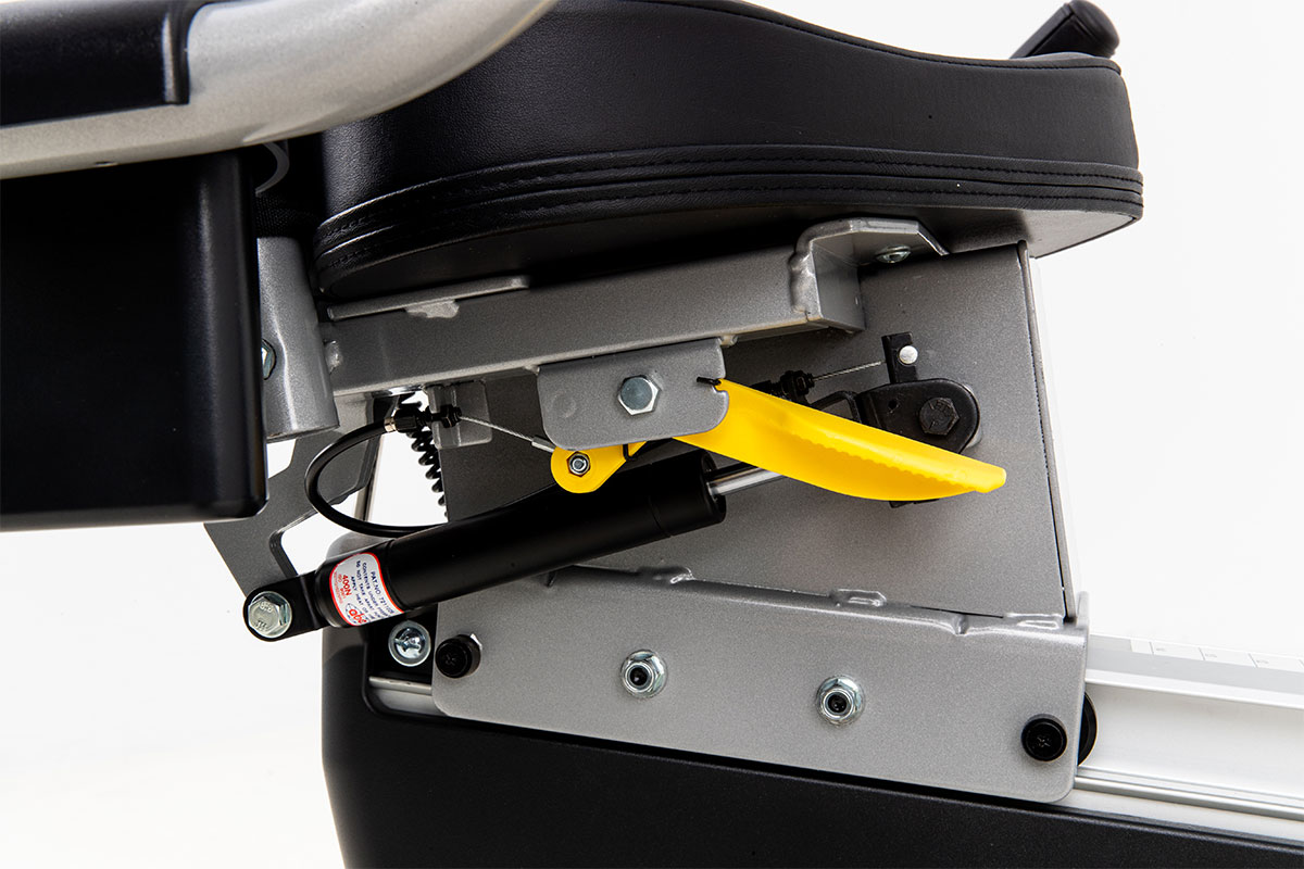 Сиденье регулируется в горизонтальной плоскости, имеет продольное позиционирование, фиксируется в установленном положении вручную с помощью специальной ручки. Спинка откидывается назад для разгрузки тазобедренного сустава во время тренировки.