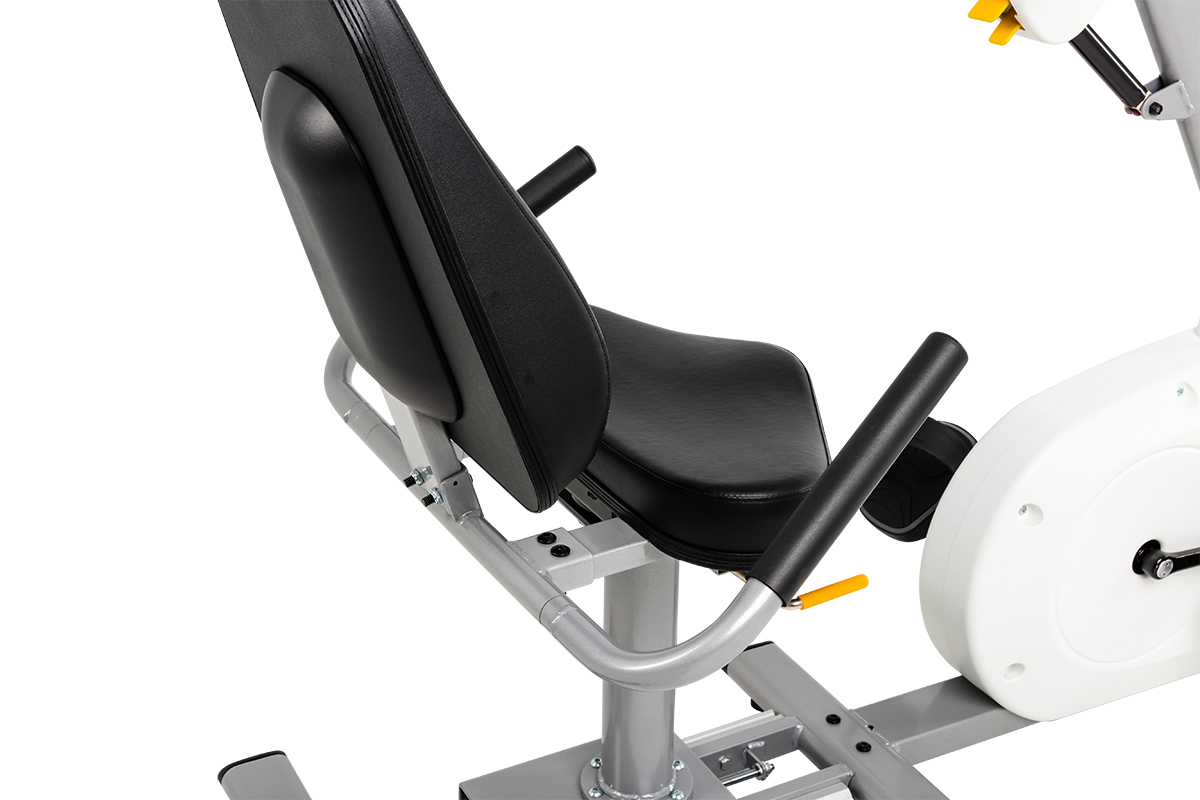 Адаптирован под занятия для пользователей на кресле-каталке. Заводское сиденье легко отсоединяется от конструкции. Педали для рук настраиваются по высоте.